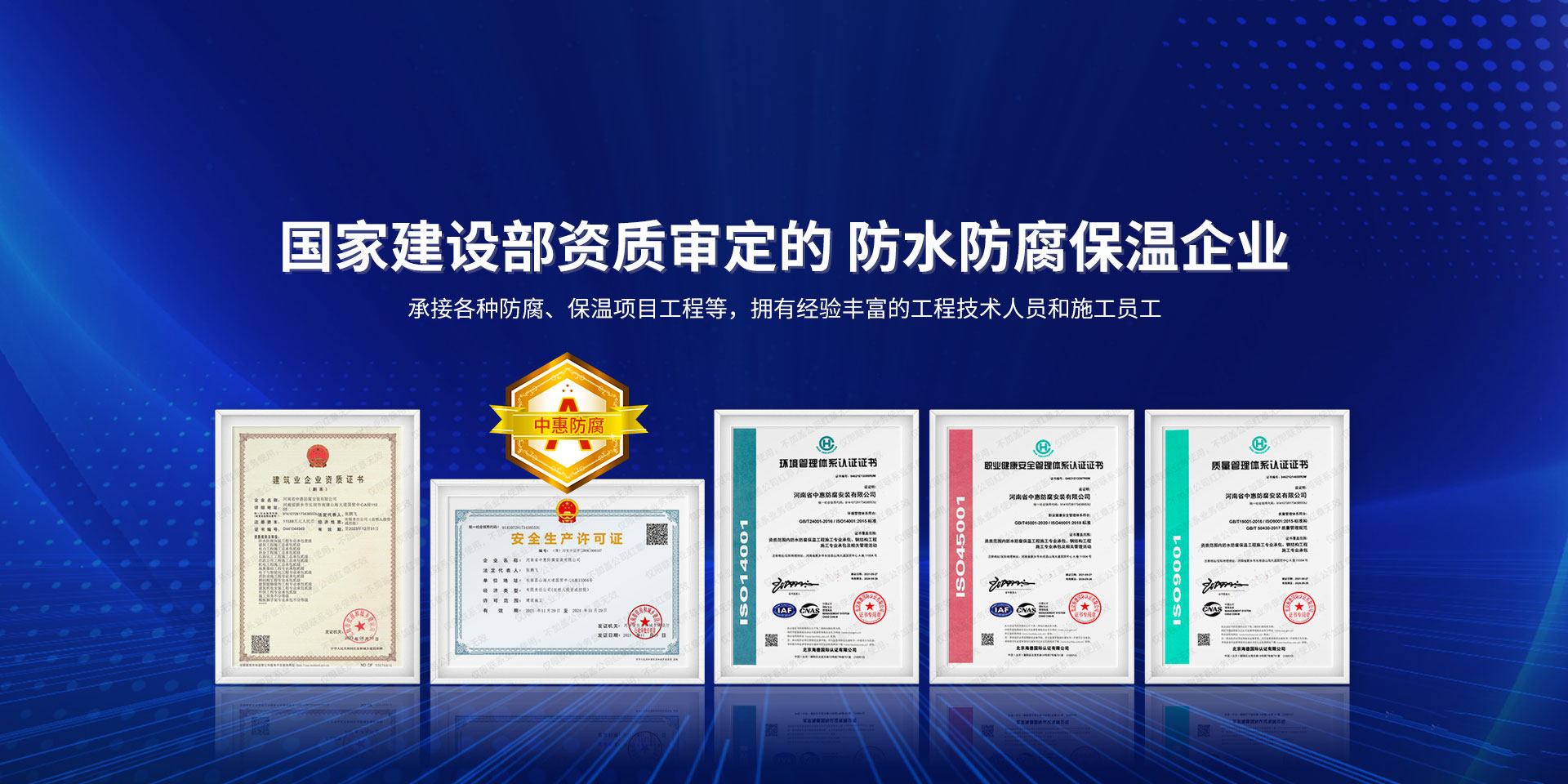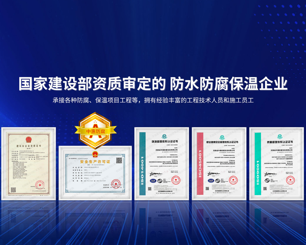 公司經營范圍:防水防腐保溫工程;消防設施工程;建筑裝修裝飾工程;建筑機電安裝工程;電力工程;建筑工程;石油化工工程;工業清洗工程;油罐清洗工程;鋼結構工程;環保工程;模板腳手架工程;電纜防火封堵、防污閃噴涂、外墻外保溫工程;各類施工勞務作業;設備維修、船舶鉚焊、涂裝;電力工程材料、建材、防水材料、防火材料、防腐保溫材料銷售,并相繼通過了GB/T19001-2008idtISO9001:2008GB/T50430-2007質量管理體系認證證書。GB/T24001-2004idtISO14001:2004環境管理體系認證證書。GB/T28001-2011idtOHSAS18001:2007職業健康安全管理體系認證證書。公司是中國防腐蝕于防護協會、中國施工企業管理協會、電力協會和中國鋼結構防水協會會員單位。 公司的經營業務涵蓋了石油、化工、電力、冶金、煤炭、船舶、國防、燃氣、水利、環保、交通運輸、航空及國防軍工和輕紡市政等行業的防腐保溫絕熱設備。鋼結構安裝、防火、防水、金屬噴鍍、聚脲噴繪、陰極保護、防滲透堵漏、玻璃鋼及各種磚版材料襯里、橡膠襯里、煙氣硫和耐酸溶劑腐蝕等工程施工。公司連續十年榮獲“省市先進施工企業”“安全生產先進單位”“重合同,守信用企業”和“AA***資質企業”的稱號。2000年被命名為市級文明單位,2002年被國家工商行政管理局命名為“重合同,守信用的企業”、被中國工業防腐蝕技術協會命名為“防腐蝕企業,能源節約及環境保護領域有豐富的經驗和***的業績。工程一次交驗合格率100%。其中攀枝花鋼鐵公司煉鐵廠四號高爐及熱風爐防腐工程、上海寶鋼公司煤氣柜防腐工程、撫順石油一廠裝置防腐項目、齊魯石化公司稀烴廠高塔防腐工程、吉林化學工業公司煉油廠油罐防腐工程、天津石化熱電廠六號爐頂棚聯絡管保溫工程、大慶油田(太倉)力神泵業工程、中國化學工程第十一建設工程、中原油田勘探局工程、中國石化銷售有限公司華北分部、魯皖輸油管道工程、貴州開磷息烽合成氨工程、陜西黃陵煤化工程、中國石油天然氣西部管道塔里木輸油工程、邯鋼集團邯寶鋼鐵公司煉鐵工程、德州供電工程、吉寶(南通)船廠工程,偃師華潤熱力工程、鄭州熱力總公司。 河南省中惠防腐安裝有限公司愿以豐富的施工經驗,***的技術,***的設備,***的管理,***的服務,竭誠為國內外廣大的用戶提供***滿意、******的工程作品。 我公司愿與國內外同仁一道,團結協作,共同推進防腐蝕行業發展! 公司地址:河南省長垣縣建設路北段360號 固定電話:0373-8866488 郵編:453400 網址:http://www_zhff_com_cn.gxntsy.com
